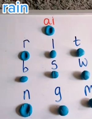 Teacher Jennie Rees (@little_miss_phonics on TikTok) shows kids how to press the Play-Doh balls for “r,” “ai,” and “n” to make “rain.”